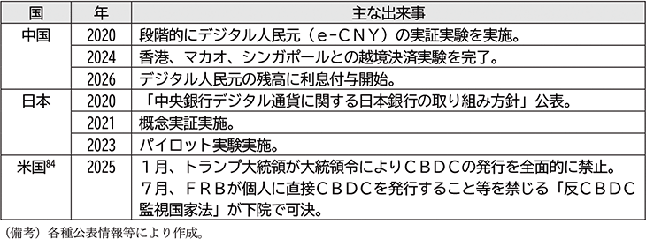 なお、他の主要国でもCBDCの検討は進められているが、国によって検討状況は大きく異なる(表3)。中国では既に越境決済が行われる等、最も実証実験が進んでおり、ユーロ圏は中国に次いでCBDCの正式発行に近づく可能性がある。