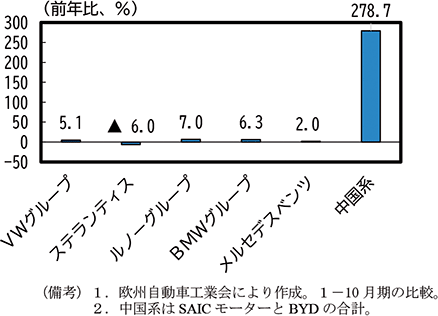 一方で中国は、リチウムやコバルト等EVバッテリーの主要原材料89の供給国90であることから(図3)、中国系メーカーは相対的に安価なバッテリーを生産でき91、価格競争力の高い車種を投入して海外市場での存在感を急速に拡大している。EU域内の中国系自動車メーカーの登録台数は2025年に前年比約2.8倍となった(図4)。欧州委員会は2024年から中国から輸入されるBEVに最大45%の関税を課している92が、PHEVにはこの関税が適用されないため、HEVやPHEVが伸びをけん引していると考えられる。