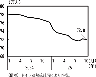 EV化の進展、中国メーカーの台頭、鉱物資源の供給リスクという複数の構造的要因により、ドイツの自動車メーカーでは雇用調整が始まっている。2024年にはドイツのフォルクスワーゲン社(Volkswagen)(以下「VW」という。)が操業以来初となる国内工場閉鎖を発表し、その後も各社で人員削減が発表96される等、雇用調整が業界全体に及び始めている。実際の自動車製造業の雇用者数の推移をみると、2024年初めには約78万人であったが、同年後半から減少が加速し、2024年12月には約76万人、2025年8月には約71万人まで減少している(図5)。対象は派遣や契約社員のみならず、正規雇用にも及んでいる。