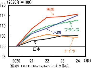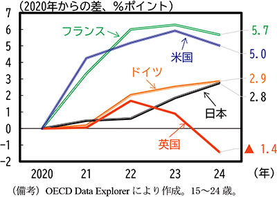 英国は、2020年以降実質GDP成長率が堅調に推移しているにもかかわらず、主要国の中で唯一、若年層の就業率が低下している(図1、2)。