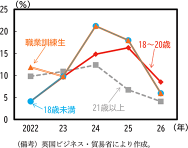 経済不活発者から就学等の教育要因を除いたいわゆるニート108の割合についても、2021年以降上昇傾向となっており(図4)、英国政府も若年層のニートの割合上昇を社会課題として認識し、2025年11月、その背景に関する調査を実施することを公表109した。