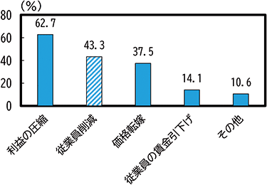 続いて、労働需要の動向を確認すると、2024年4月に実施された大幅な最低賃金引上げ(図5)や国民保険料の企業負担増加110に伴う企業の雇用コスト増加により、雇用を抑制する動きがみられており、英国の求人率は低下傾向にある(第2-3-39図)。イングランド銀行(以下「BOE」という。)等による企業調査によると、国民保険料の企業負担増加への対応として「従業員削減」と回答した企業は40%を超えている(図6)。