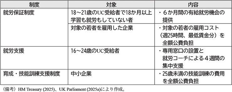 若年層の非労働力化への対策として、2024年11月公表の労働白書(Get Britain Working)では、若年層に給付金ではなく就労機会を提供する就労保証制度や、育成・技能訓練支援制度113を含めた雇用支援制度改革の方針が示され、2025年秋季予算において具体的な内容が公表された(表8)。リーヴス財務大臣の発言によれば、支援対象のUC受給者が正当な理由なく就労を拒否した場合は、給付を停止または減額114する方針だという。