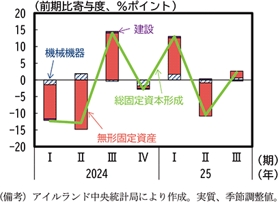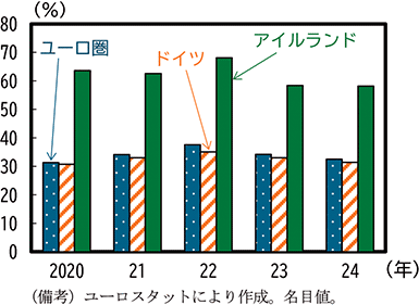2025年4-6月期には米国の通商政策に伴う駆け込み需要のはく落からユーロ圏全体の実質GDP成長率は減速したが、7-9月期は個人消費の伸びが鈍化する中、政府消費と総固定資本形成が成長に寄与した(第2-3-1図(1))。国別寄与度をみると、2024年7-9月期から2025年1-3月期まで、ユーロ圏の3.7%の経済規模にすぎないアイルランドによる押上げが大きく寄与59している(第2-3-1図(2)、第2-3-2図、コラム3参照)。これは第1章でみたとおり、米国のトランプ大統領による医薬品に関する関税措置への言及に伴い、医薬品企業が多く集積するアイルランドから米国への駆け込み輸出が発生したことによるものだが、2025年4-6月期以降はその寄与はなくなり、ユーロ圏の成長はフランスとスペイン60の寄与が大きくなっている(第2-3-1図(2))。
