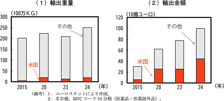 2015年から2024年の医薬品の輸出動向をみると、輸出重量は1.25倍の増加にとどまる一方、名目輸出額では約2.5倍に増加している。重量の伸びを大きく上回る金額の伸びは、輸出される医薬品の単価が上昇していることを示している(図4)。