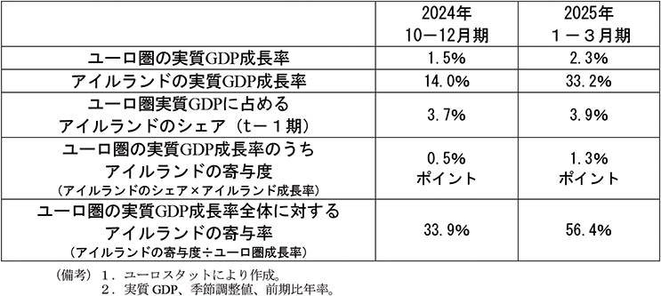 このように、アイルランド経済は多国籍企業、とりわけ知的財産権の移転や医薬品輸出の影響を受けやすい。これらはGDPを構成する投資や付加価値として直接計上されるが、一時的かつ巨額に変動することがあり、GDP統計は実体経済の動き以上に変動しやすい構造となっている。また、その変動率の高さがユーロ圏全体の統計にも強い影響を与えている。ユーロ圏の2025年1-3月期の実質GDP成長率(2.3%)のうち、アイルランドのGDP成長率(33.2%)の寄与率は56.4%に達した(表5)。アイルランド一国のGDPシェアはユーロ圏全体の3.9%にすぎない一方、その成長率の振れ幅の大きさにより、ユーロ圏全体のGDP成長率の半分以上も押し上げたことになる。