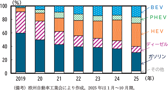 EU域内の新車登録台数の内訳をみると、2024年にはHEV、PHEV、BEVの販売シェアが、ガソリン車とディーゼル車を抜いて過半を占める状態となり、さらに2025年には新車の4台に1台がPHEV、BEVとなった(図1)。