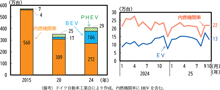 第1章で述べたとおり、米国の関税措置によって、ドイツ系メーカーの自動車販売は米国市場で急速に減少している。また中国向け輸出も落ち込んでいることから、ドイツでは自動車産業の低迷がみられる。本コラムでは、ドイツの電気自動車(EV85)の生産動向とドイツ経済への影響について検討する。