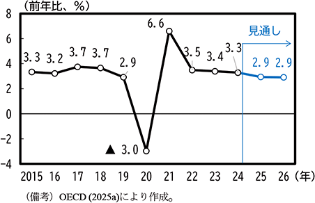 2025年6月に公表されたOECDの世界経済見通しでは、世界の実質GDP成長率は2024年の3.3%から2025年には2.9%に低下し、2026年も2.9%で推移すると予測されている(第1-4-1図)。その背景には、関税率の引上げや政策不確実性の高まりによって設備投資や貿易の伸びが抑制されること、貿易コストの増加による最終財価格の押上げや消費者マインドの悪化によって消費の伸びが低下することなどがある。世界の実質GDP成長率が3%を割り込むのは、世界的な感染症拡大により経済活動が抑制された2020年(▲3.0%)を除くと、第一次トランプ政権下の米中貿易摩擦が激化した2019年(2.9%)以来となる(第1-4-2図)。