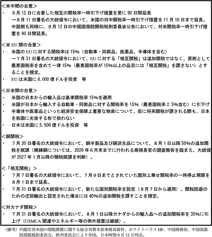第2章で詳述するが、2025年1月の米国第二次トランプ政権発足後、トランプ大統領は、中国、カナダ、メキシコからの輸入に対する国別追加関税や、鉄鋼、アルミニウム、自動車・同部品の輸入に対する品目別追加関税、「相互関税」といった関税措置を相次いで導入するとともに、更なる追加関税措置も視野に医薬品や半導体等の調査を実施している。このうち、「相互関税」の国別上乗せ分については、当初7月9日、その後延長され8月1日まで適用が停止された。また、米中間の関税率は当初8月12日、その後延長され11月10日まで相互に一時引下げとなったほか、英国に対しては自動車の輸入に対する追加関税について年間10万台までの関税割当制度を設ける、7月には日本やEU等と新たな関税率に関する合意に至るなど、各国・地域との交渉を通じて米国の関税措置や相手国・地域の対抗措置に変化が生じる動きもみられる(第1-4-3表)。7月31日には、各国・地域との交渉を踏まえた新たな国別関税率(8月7日から適用)を定めた大統領令が署名されたところであり、引き続き米国の通商政策や各国・地域の対応等の関連動向を注視していく必要がある。
