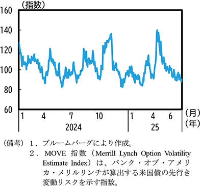 米国の通商政策の動向を受けて、特に「相互関税」や対中関税率の引上げが相次いで発表された2025年4月にかけて世界の株価、金利、為替、国際商品価格の変動が高まった(第1-4-4図、第1-4-5図)。5月12日の米中間の合意等、米国と各国との通商交渉の進展もあり、その後はこうした金融資本市場の変動が更に高まっている状況とはいえないものの、引き続き、米国の通商政策等を受けた金融資本市場の変動の影響に留意する必要がある。
