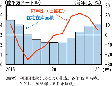 第2節でみたように、中国では、不動産市場の停滞が継続している。2022年前後から下落が継続してきた新築住宅販売価格については、各種政策支援もあって2025年春頃には大都市を中心に下げ止まりの動きがみられたが、依然として不動産開発投資が前年比で大幅な減少を続けているほか、住宅在庫も対前年比で増加を続けているといった状況には変化がみられない(第1-4-6図)。今後進展していく人口減少が住宅需要を下押しすることも考慮すると、短期的に不動産市場の停滞状況が大きく改善することは見通しにくい。不動産市場の停滞が長期化した場合、負の資産効果98等を通じて中国の景気を下押しする可能性があり、その影響が貿易や投資を通じて世界全体の景気を押し下げるリスクがある。