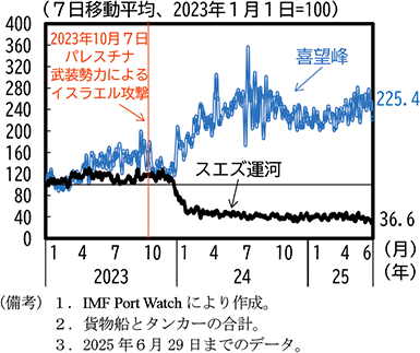 中東では、2023年10月に発生したイスラエル及びパレスチナ武装勢力間の衝突と、翌11月のイエメン国内の武装勢力であるホーシー派による紅海航行船舶への攻撃を受け、欧州とアジア間の海運がスエズ運河を回避して喜望峰回りとなる動きが生じ、2025年に入ってもその傾向は継続している(第1-4-7図)。イスラエルとパレスチナ武装勢力間の衝突は、2025年1月に6週間の停戦合意が成立したものの、3月以降はその延長に向けた交渉が停滞し、イスラエル軍はガザ地区での地上作戦を再開している。また、6月13日、イスラエルはイランの核関連施設等を攻撃し、これに対してイランも報復攻撃を行うなど、双方で報復の応酬となった。さらに、6月22日には米国がイランの核関連施設3か所を攻撃し、一段と緊張が高まったが、同月23日に米国のトランプ大統領がイスラエルとイランの停戦が発効する旨を表明した。こうした中東情勢が、今後一層緊迫化する場合、原油価格や輸送コストの上昇等を通じて世界の物価上昇率を高め、経済を下押しする可能性がある。