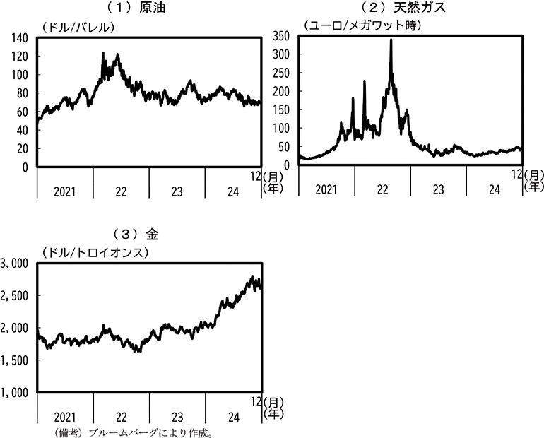 また、2022年2月に始まったロシアによるウクライナ侵略は3年を経過してもなお継続しており、欧州では安価であったロシアからの天然ガス輸入を米国等へ代替させる動きが続いている。また、ウクライナは小麦の主要生産国であることから、2022年には小麦の国際市況が高騰する事態も生じた。足下では、これらの国際商品価格は2022年の高騰からは落ち着きを取り戻しているが、ウクライナ情勢をめぐる不確実性は依然として高い状態が続いており、国際商品市況の変動に伴う世界的な物価上昇や経済への下押し圧力が再び生じる可能性には留意する必要がある。