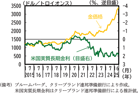 こうした動向の中、2021年頃までおおむね成り立っていた金価格と米長期金利との逆相関関係が2022年頃からみられなくなってきている(図3)。一般に、金の需要は実質金利が上昇すると低下し、また、不確実性が高まる局面では安全資産としての金の需要が高まるとされているが、2022年頃からは実質長期金利が上昇していく中で金価格は低下せず、2024年以降は実質長期金利が2%前後で安定的に推移する中で金価格は騰勢を強めている。2022年以降、ロシアによるウクライナ侵略やイスラエルとパレスチナ武装勢力との衝突を発端とした中東情勢の緊迫化、更には2025年の第二次トランプ政権発足に伴う米国の通商政策の大幅な転換など、地政学的リスクや政策の不透明感が高まる中で、安全資産としての金の需要が大きく高まっているものと考えられる。
