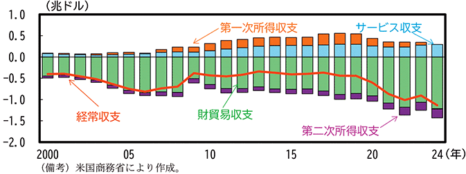 米国の経常収支は、近年、赤字で推移している(第2-1-1図)。2000年から2023年まで財貿易収支と第二次所得収支は赤字、サービス収支と第一次所得収支は黒字で推移してきたが、2024年に第一次所得収支は赤字に転じた。本章では、こうした経常収支の各項目の動向の背景にある構造的な要因について分析を行う。