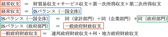 すなわち、財貿易収支、サービス収支、第一次所得収支、第二次所得収支の合計として定まる経常収支は、一国全体のISバランスに一致する。さらに、一国全体のISバランスは、米国の部門(家計部門、企業部門、政府部門)別のISバランスの合計として表すことができる。このうち、政府部門のISバランスは、一般政府の財政収支に相当する概念である。一般政府財政収支は、連邦政府財政収支、州・地方政府財政収支の合計である。