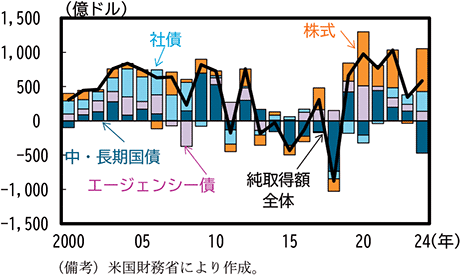 なお、対米証券投資に関連して、外国政府・外国居住者による米国長期証券の年間の純取得額の推移を第2-3-10図87に示す。2019年以降、米国株式の取得が増加しており、投資先としての需要が高まっている。