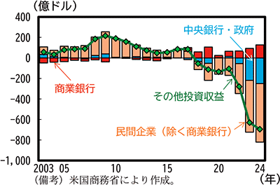 最後に、その他投資の収支をみると(第2-3-11図)、2017年までは黒字で推移してきたが、2018年以降は赤字に転じており、その赤字額は2023年以降、拡大している。部門別では、民間企業(除く商業銀行)と中央銀行・政府は赤字が拡大している一方、商業銀行は2016年以降黒字になっている。