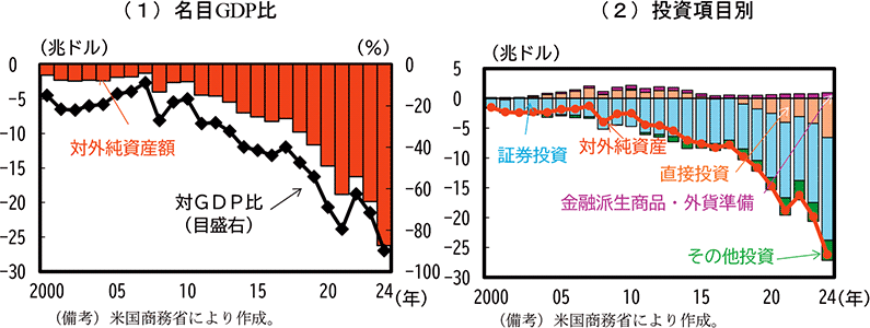 ここまでフロー面での投資所得の内訳及び推移をみてきたが、ストック面での対外純資産残高(Net International Investment Position:NIIP)についても確認する。米国では、対外負債が対外資産を恒常的に上回っているため、負の対外純資産(対外純負債)が続いており(第2-3-14図)、その値は2010年以降、拡大傾向にある。対外純負債は、対GDP比でも、2010年以降上昇しており、2024年には対GDP比▲89.9%となった。IMFによると、2023年以降の対外純負債額の拡大は、米国株価の上昇によるバリュエーション効果の寄与が大きく、2022年(対GDP比▲61.2%)から2023年(同▲70.7%)の拡大のうち、約4分の3を占めるとされている88。