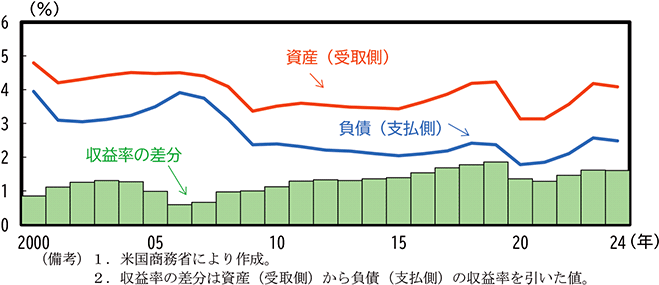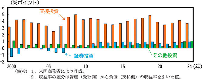 しかし、これまでみてきたとおり、この構造に変化が生じつつある。第2-3-14図のNIIPでは、2018年に初めて直接投資の資産を負債が上回った。さらに、第2-3-18図における対外・対米直接投資の収益率の差分は2022年以降縮小し、2024年には証券投資収益・その他投資収益の赤字を直接投資収益の黒字が下回ったことで、第一次所得収支は統計上初めて赤字となった。