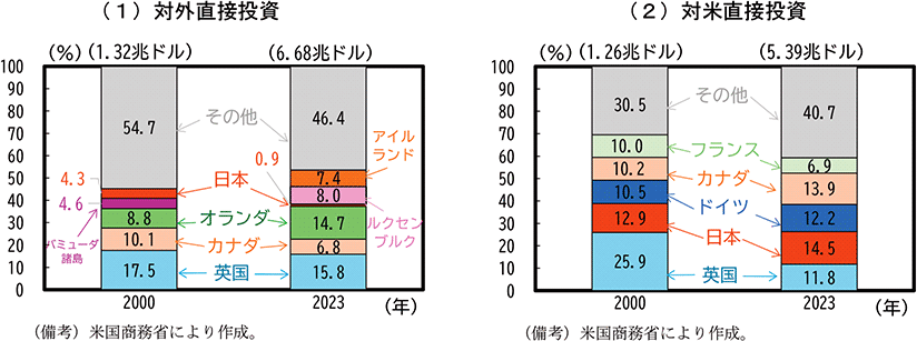 (1)図から、2000年に1.32兆ドルであった対外直接投資残高は、2023年に6.68兆ドルに増加したことがわかる。対外直接投資先の順位は、2000年は英国、カナダ、オランダ、バミューダ諸島、日本と続く。一方、2023年においては英国、オランダ、ルクセンブルク、アイルランド、カナダとなっている。なお、日本は2000年時点では4.3%を占め、全世界で5番目の対外投資先であったが、2023年には0.9%となっている。この順位変動には、米国による諸外国の非金融持株会社への投資増加が影響しており、詳細は後述する。