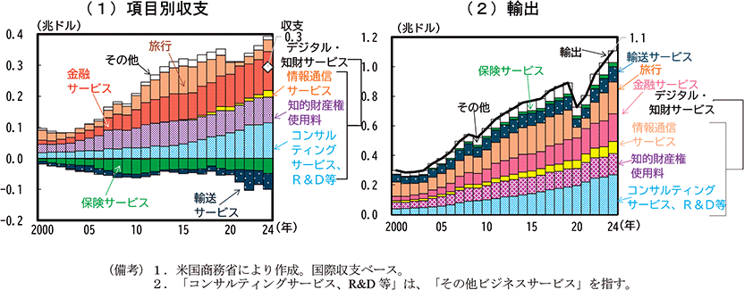 米国経済は、財貿易は赤字である一方、サービス貿易は黒字となっており、とりわけ高付加価値のデジタル・知財サービスの輸出に強みがある。また、米国は世界各国に直接投資を行い、高い収益率で直接投資収益を上げている。