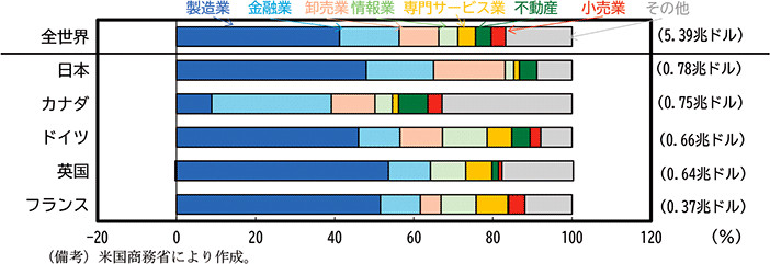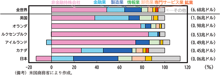 非金融持株会社を除くと、最大の対外投資先である英国については、金融業の割合が高く、カナダや日本については製造業の割合が高い。