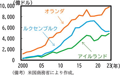 一方、アイルランドも非金融株式会社のシェアが高いものの、第1節で確認したとおり、アイルランドからは医薬品関連の輸入が多くみられており、医薬品産業に関わる実態のある事業会社(製造・販売・研究開発会社など)が多数存在する。それに加えて、アイルランドへの知的財産権使用料のサービス輸出額は、対外直接投資額では上回るオランダ、ルクセンブルクに比べて大きく、2024年では2国合計の3倍以上である(第2-3-21図、第2-3-22図98)。つまり、アイルランドにおける非金融持株会社は、統括会社として置かれた側面がありつつも、域内で稼ぐ知的財産権が集約された、アイルランド国内の製造・販売会社の親会社としての色合いが強い。したがって、非金融持株会社としては、