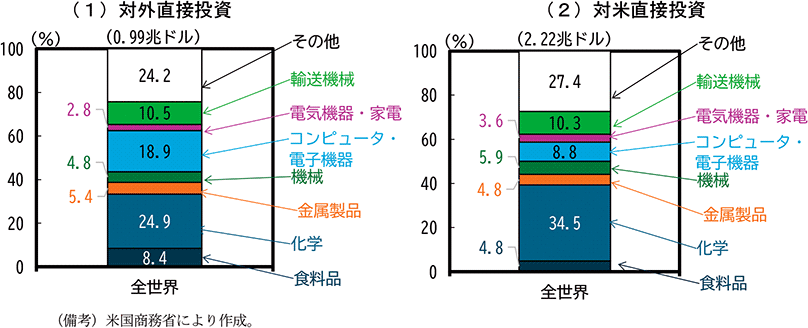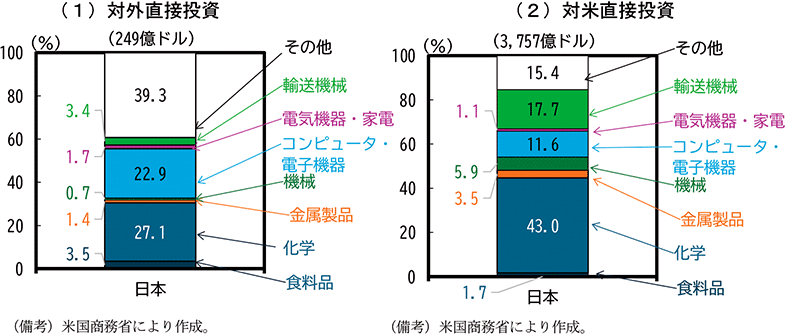 製造業については、第二次トランプ政権がアメリカ・ファースト政策に基づく通商政策や規制緩和、税制優遇措置等を通じて米国内へ回帰させることを目指している。その製造業への対外・対米直接投資残高(ストック)の金額とその業種別の内訳(2023年)を確認すると(第2-3-24図)100、対外・対米ともに製薬含む化学企業への直接投資が最も大きい。また、食料品やコンピュータ・電子機器については、対米直接投資が対外直接投資の半分程度にとどまる。