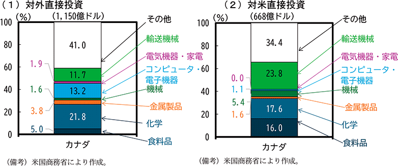 また、カナダについては(第2-3-26図)、対外直接投資は化学、コンピュータ・電子機器、輸送機械の順に多く、対米直接投資は、自動車を含む輸送機械が23.8%と最大で、化学、食料品の順に多い。自動車産業に関する分業体制が主にUSMCA地域内で構築されていることが、輸送機械の割合の高さに反映されている。また、食料品についても第1節で触れたように、カナダ・メキシコからの輸入額が多いことに関連しているとみられる。