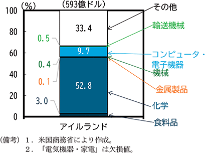 アイルランドについては(第2-3-27図)、対外直接投資は化学が52.8%と半分以上を占める。今までみてきたとおり医薬品関連の企業への投資が多いことが反映されているとみられるものの、前述のとおり大半は非金融持株会社に分類されている。なお、対米直接投資額は欠損値が多く、分析が困難である。