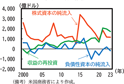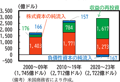 で構成され、これらの毎年の純流入額の推移を第2-3-28図に示す。収益の再投資については増加基調にある一方で、株式資本の純流入は2015年に頭打ちとなり、2021年から2023年にかけては3年連続で再投資収益が株式資本の純流入を上回った。これらの毎年のフローの年平均額は、2000年代に1,745億ドルであったが、2010年代には在米外資系企業の投資増加と既存の在米企業の収益増加の両方に起因し、2,712億ドルにまで増加した(第2-3-29図)。2020年代に入ってからも、平均で2,722億ドルと、堅調なペースで米国への直接投資の流入が進んでいる。ただし、その内訳については変化が生じており、2000年代には株式資本の純流入が1,745億ドル(80.4%)であったが、2020年代には1,273億ドル(46.8%)にまで低下した一方、収益の再投資は176億ドル(10.1%)から1,617億ドル(59.4%)に上昇した。つまり、既存の在米企業があげる収益が海外へ還流せず米国内で再投資される金額は増加する一方、新規の直接投資の流入は伸び悩んでいる。