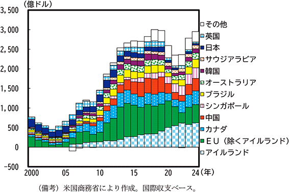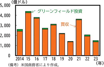 米国への直接投資は、買収による投資がグリーンフィールド投資(事業拠点の新規設立・拡大)を大きく上回り、全体の9割以上を占める。2015年に買収による投資が増加しているが、これは主にアイルランド企業による医薬品企業の買収が急増したことに起因している(アイルランドの2015年投資額は1,759億ドル、前年差+2,326億ドル)。さらに2016~18年にかけても主にカナダや英国などから、3,000億ドル前後の対米直接投資が続いたことが、この時期に対米直接投資残高が増加した要因である。また、感染症拡大後の2021年にも大きく増加しているが、2022年から23年にかけては2年連続で減少しており、新規の直接投資が減速傾向にあることが示されている。