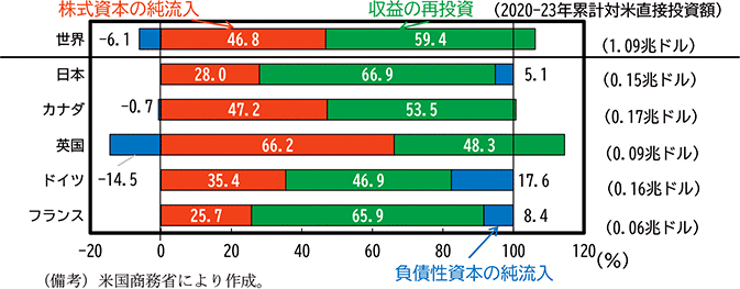 また、第2-3-30図は、対米直接投資残高の2023年上位5か国について、2020年代累計の対米直接投資の純流入額を示している。日本やフランス、ドイツについては、2020年代に入り、新規の株式資本の流入は少ないにも関わらず、既存の米国子会社で得た利益の再投資による対米直接フローの積上げが大きく、資本の引上げも少ないため、対米直接投資残高の上位を維持していると考えられる。一方、カナダは、株式資本の純流入のシェアが全世界や他の上位国に比べ高く、新規案件が比較的多いと推察される。また、英国は負債性資本の引上げ(親子ローンの返済や債券の償還など)が他国に比べて多かったとみられ、第2-3-19図で示したとおり、直接投資残高全体に占める割合が低下した。
