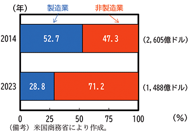 また、新規の対米直接投資全体に占める製造業の割合は、大型案件によってブレが生じるものの、直近では3年連続で減少しており、海外からの直接投資の対象企業に変化がみられる(第2-3-32図)。具体的には、2022年は情報サービス業、2023年は運輸・倉庫業や専門サービス業における直接投資額が多かったと報告されている101。