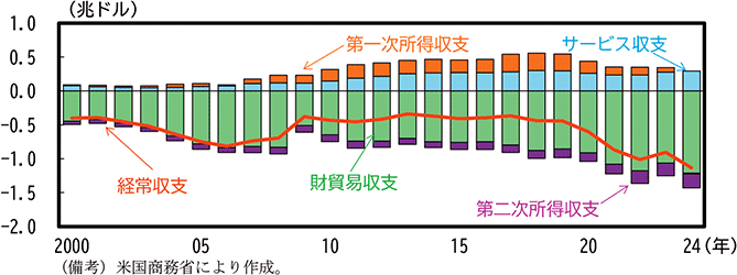 ここまでみてきたとおり、米国では、財貿易の赤字が大きい一方、サービス輸出や直接投資が活発に行われている。財の貿易収支、サービス収支、所得収支を総じてみた経常収支をみると、2000年以降、貿易収支・第二次所得収支102の赤字額がサービス収支・第一次所得収支の黒字額を上回り、経常赤字となっている(第2-3-33図)。経常赤字額は、世界金融危機後の2010年代はおおむね横ばいで推移してきたものの、2020年以降、拡大傾向にある。要因として、感染症拡大後の回復期以降、貿易赤字が拡大したことに加え、第2項でみてきたとおり、第一次所得収支が縮小していることが挙げられる。