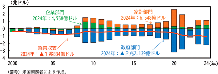 第2-3-34図は、米国の部門(家計部門、企業部門、政府部門)別のISバランスを示している。米国のISバランスは、民間部門の家計・企業部門は黒字、政府部門は赤字であり、その和である経常収支は赤字となっている。政府部門のISバランスは財政収支と同義であるが、歳出が歳入を上回り(財政赤字)、不足分は国債発行により賄っている。言い換えると、民間部門の貯蓄と経常収支の赤字の合計額は、政府部門の赤字と同額になるように同時決定されている。
