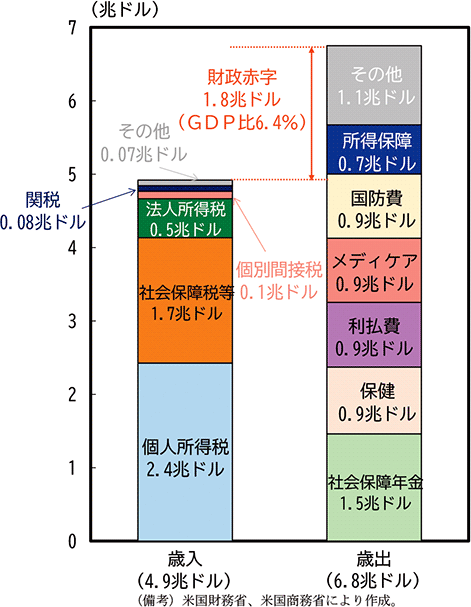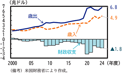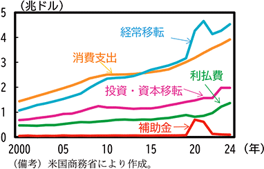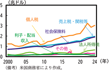 次に、連邦政府の歳入・歳出の内訳項目別に確認する(第2-3-41図)。2024年度における連邦政府の歳入は4.9兆ドル、歳出は6.8兆ドルであり、1.8兆ドルの財政赤字となっている。歳入・歳出の内訳をみると、歳入は大きい順に個人所得税、社会保障税等、法人所得税となる一方、歳出は社会保障年金(連邦老齢・遺族・障害年金など)、保健(メディケイド、オバマケアの税額控除など)、利払費、メディケア、国防費、所得保障(連邦政府職員・退役軍人年金、SNAP108など)と続く。近年は、高齢化に伴う社会保障費の増大や、債務残高拡大・金利上昇による利払費の増加(名目GDP比で3.1%)が、財政赤字の拡大に寄与している。