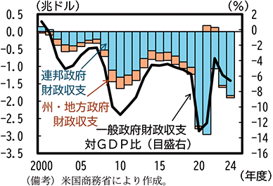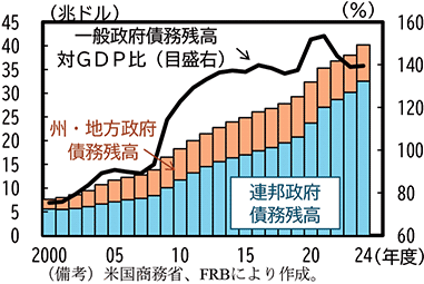 一般政府の財政収支の推移をみると(第2-3-37図)、2001会計年度106以降、連邦政府の財政赤字拡大によって、一般政府の財政赤字は拡大しており、一般政府債務残高は増加している(第2-3-38図)。ただし、経済成長と物価上昇によってGDPは名目値で上昇したため、2022会計年度以降、一般政府債務残高対GDP比は低下している。