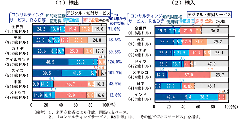 相手国別のサービス輸出の品目別シェアをみると(第2-3-3図)、全世界向けデジタル・知財サービスの輸出シェアが4割以上を占めており、特に、米国からのサービス輸出で3位であるアイルランド向け輸出はデジタル・知財サービスの輸出シェアが9割弱を占めている。アイルランド向けの輸出全体に占めるデジタル・知財サービスの輸出の割合が高い背景としては、アイルランドは、法人税率が低いことに加え、若年人口比率や教育水準が高く英語圏でもあることから、米国企業が、生産、研究・開発拠点としてアイルランドに集積していることが挙げられる81。また、2014年から2024年にかけてのデジタル・知財サービスの輸出は71%増加しており、特に、アイルランド向けは124%増加している。