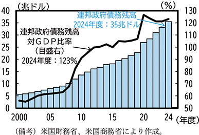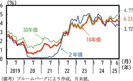以上のとおり、同法により連邦政府債務残高が更に増加することが見込まれ、これまで以上に国内外の投資家による米国債の購入が必要となることを意味する。一方、現政権による保護主義的な通商政策や諸外国のデジタルサービス税等に対する報復措置などの議論は、内外の投資家による米国債離れを誘発し、それによる金利上昇への懸念も生じさせている。金利上昇による利払費の増加、それに伴う更なる債務の拡大と負のスパイラルに陥る可能性も否定できない。第二次トランプ政権が推進する関税措置による財政赤字・経常赤字への影響とともに、それに対するマーケットの反応も注視していく必要がある。