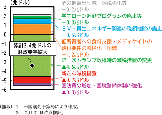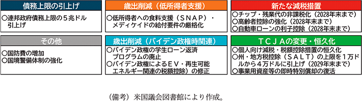 他方、SNAP・メディケイドの低所得者支援に関する厳格化や、バイデン政権時に導入されたEV・再生エネルギー関連の税額控除の廃止等、様々な歳出削減策が盛り込まれている。