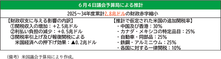 また、議会予算局は財政調整法による利払費の増加分について、下院法案時点では10年間で合計5,510億ドルになると推定しており、最終版についても同等の影響が見込まれる。