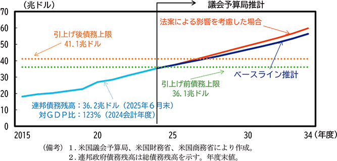 議会予算局による2025年1月のベースライン推計に財政調整法による毎年の財政収支への影響を加算した場合(7月21日推計、利払い負担増加分は含まれない)、引上げ後の債務上限41.1兆円に債務残高が達するのは2027年前半頃であると見込まれる。