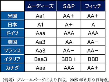 しかし、この構造の持続性には中長期的な潜在リスクがあり、債務の拡大によって米国債への信任が毀損する可能性がある。実際、2011年8月に大手格付け会社であるS&Pグローバル・レーティグスにより、米国債格付けは「AAA」から「AA+」に引き下げられた。次いで2023年8月にはフィッチ・レーティングが「AAA」から「AA+」へ引下げを決定、そして2025年5月にはムーディーズも「Aaa」から「Aa1」に引下げを行い113、米国債は主要格付け機関3社による最高位の格付けを失った(第2-3-47表)。今後、更なる引下げがなされた場合、金利の上昇など金融市場に影響を与える可能性がある。