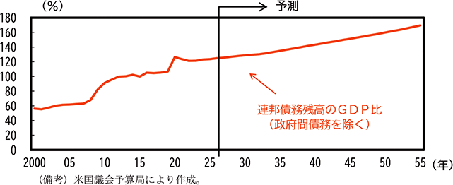 議会予算局の長期予測によると、政府債務の対GDP比は今後も拡大を続け、2055年には169%にまで増加する見込みである(第2-3-48図)。さらに、このような財政拡大局面ではクラウディングアウト114によって民間部門の投資が抑制されてしまう可能性もある。