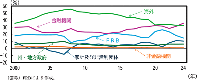 近年では、海外による米国債の保有比率は低下傾向にある。資金循環統計で米国債の保有部門を確認すると(第2-3-49図)、かつては海外部門が最大の保有部門であり、全体の半分程度を占めていたが、2024年末には32.6%まで減少し、米国内の金融機関部門を下回った。なお、金融機関部門の中ではマネー・マーケット・ファンド(MMF)が最大の保有主体となっている。