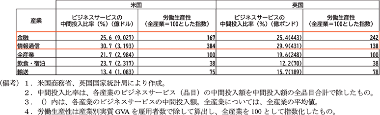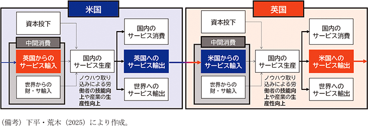 米英間でのビジネスサービス貿易は、一方的な取引ではなく、国内での知識の蓄積・応用を経て、再び国外へとサービスが輸出される相互関係にあると考えられる83(第2-3-5表)。直接投資や国際分業を通じた企業間ネットワークの形成といった水平分業によって高度なサービスの輸出入が可能となり、産業全体の生産性向上と経済全体の成長拡大に寄与していると考えられる。