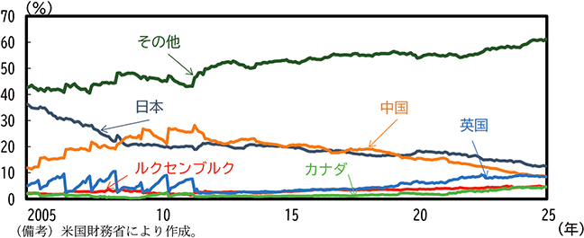 海外部門の国別の保有比率の上位5か国(2024年末時点)の推移をみると(第2-3-50図)115、日本は現在も世界最大の米国債保有国であるが、その比率は、2000年台前半の30%台から低下し、2024年末には12.4%となっている。また、一時最大の保有国であった中国についても2010年頃から低下してきており、2025年3月には2002年6月ぶりに英国の保有比率を下回り3番目となった。日本や中国では外貨準備として米ドルを保有するため、政府当局が安定的に米国債の購入を続けてきたが、この2か国の保有割合が低下傾向にある。一方、英国やルクセンブルクなどの保有割合が緩やかに上昇している。また、新興国が対米貿易黒字を計上していることにより、これら5か国以外の割合も大きく上昇し、米国債はより多くの国に分散して保有されるようになってきていることが分かる。